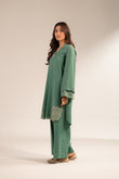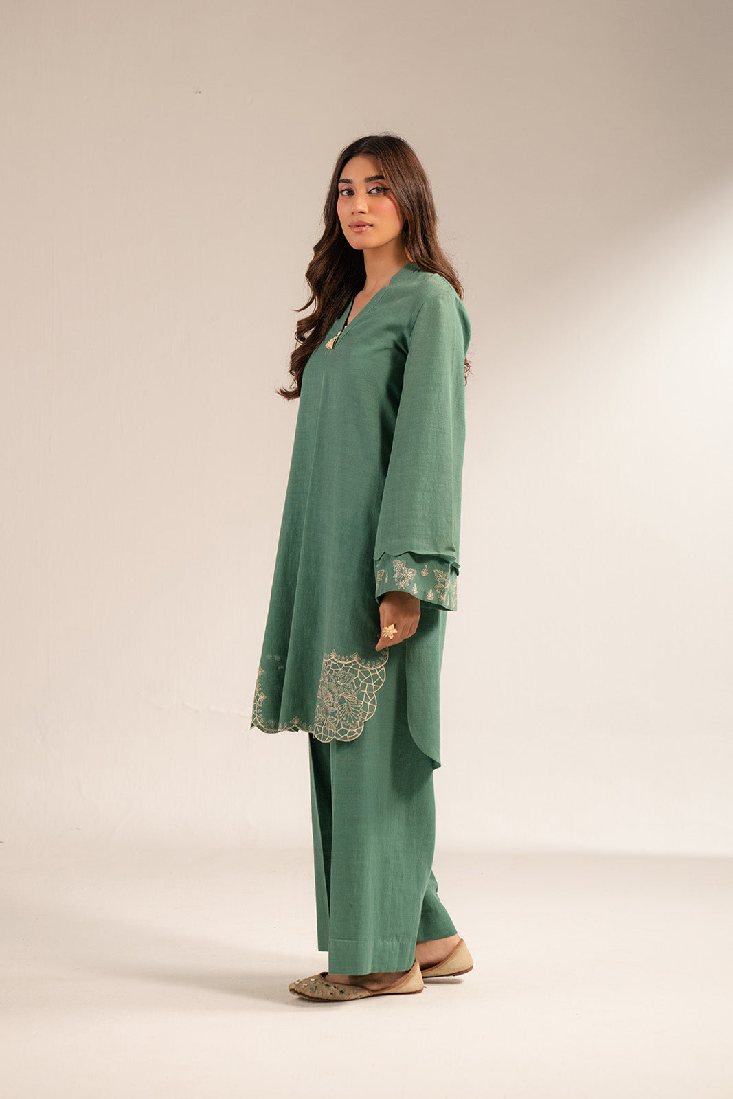 Elegant green slub khaddar dress adorned with delicate embroidery and scallop daman details.