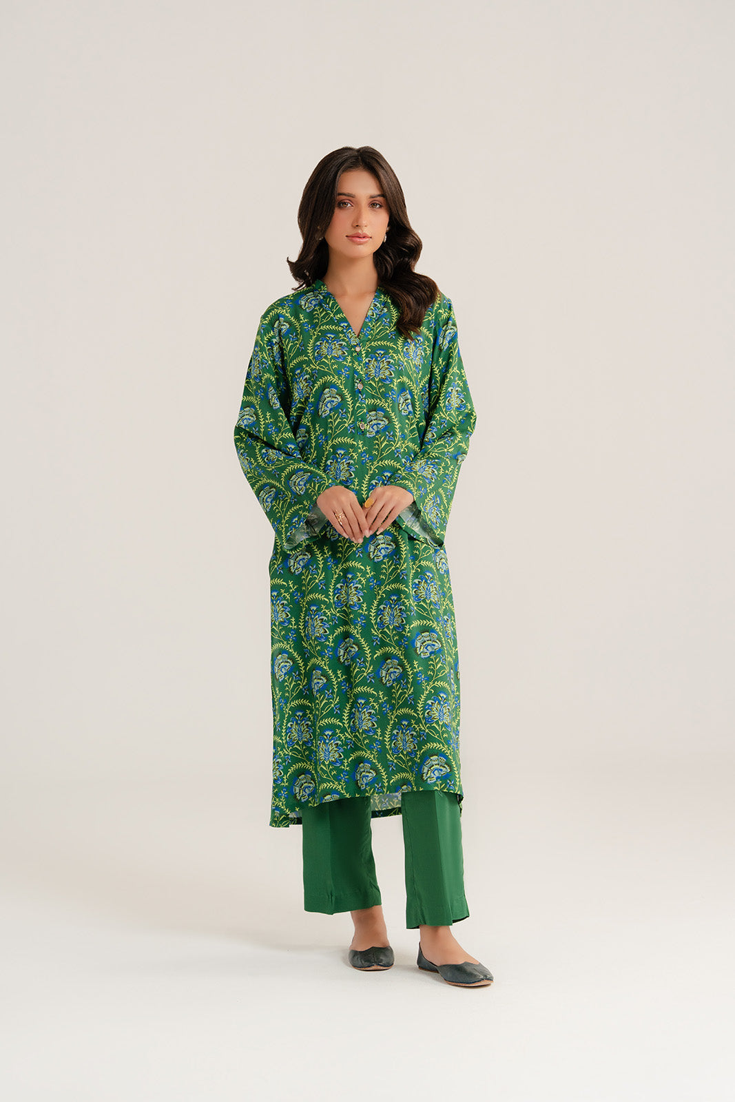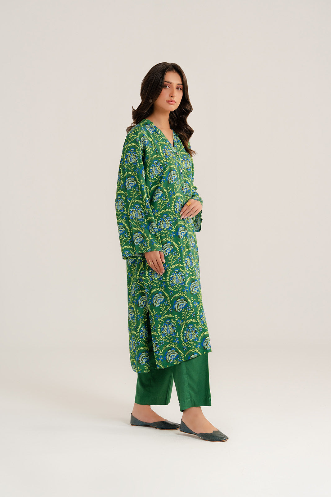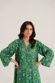 Green linen printed two piece suit detailed with printed shirt with tasseling on neckline and plain trouser.