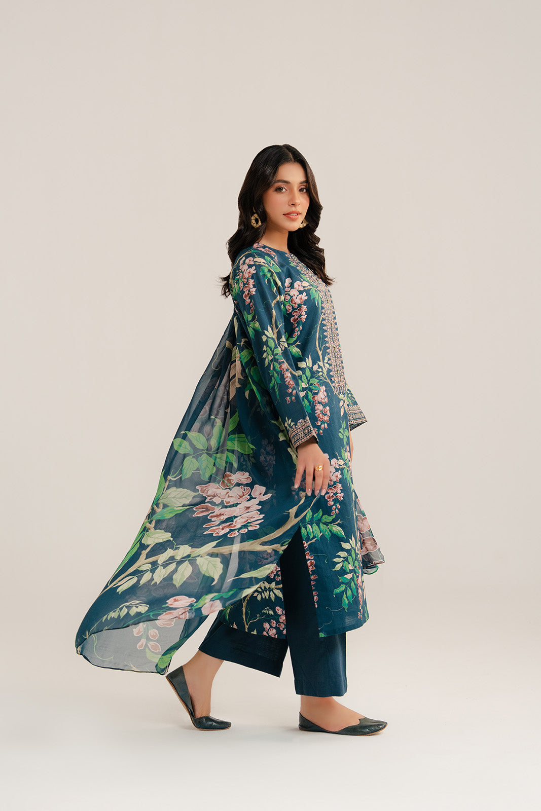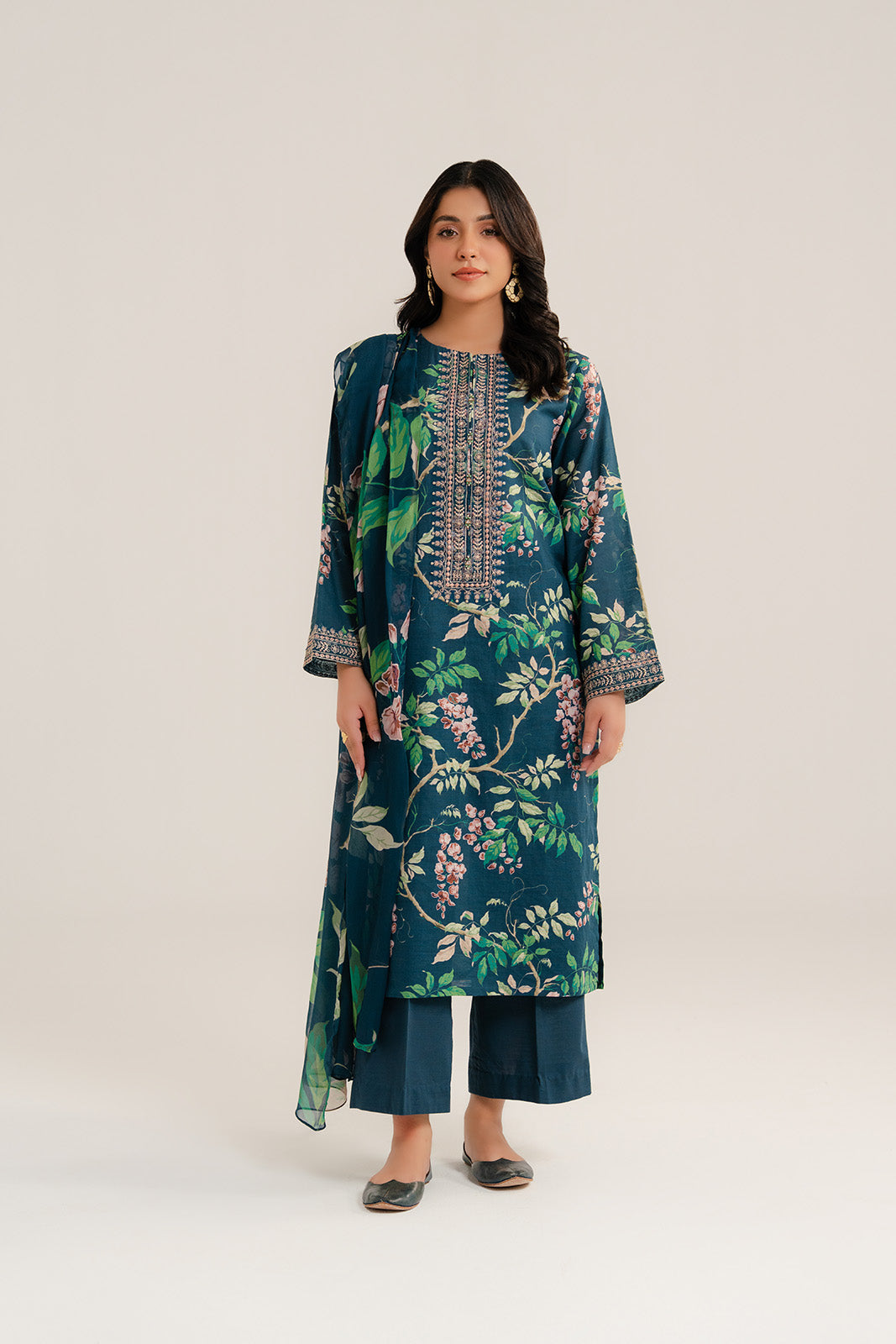 Make a statement with our blue printed embroidered three-piece suit featuring a printed shirt embroidered neckline & sleeves border paired with plain culottes & printed chiffon dupatta.