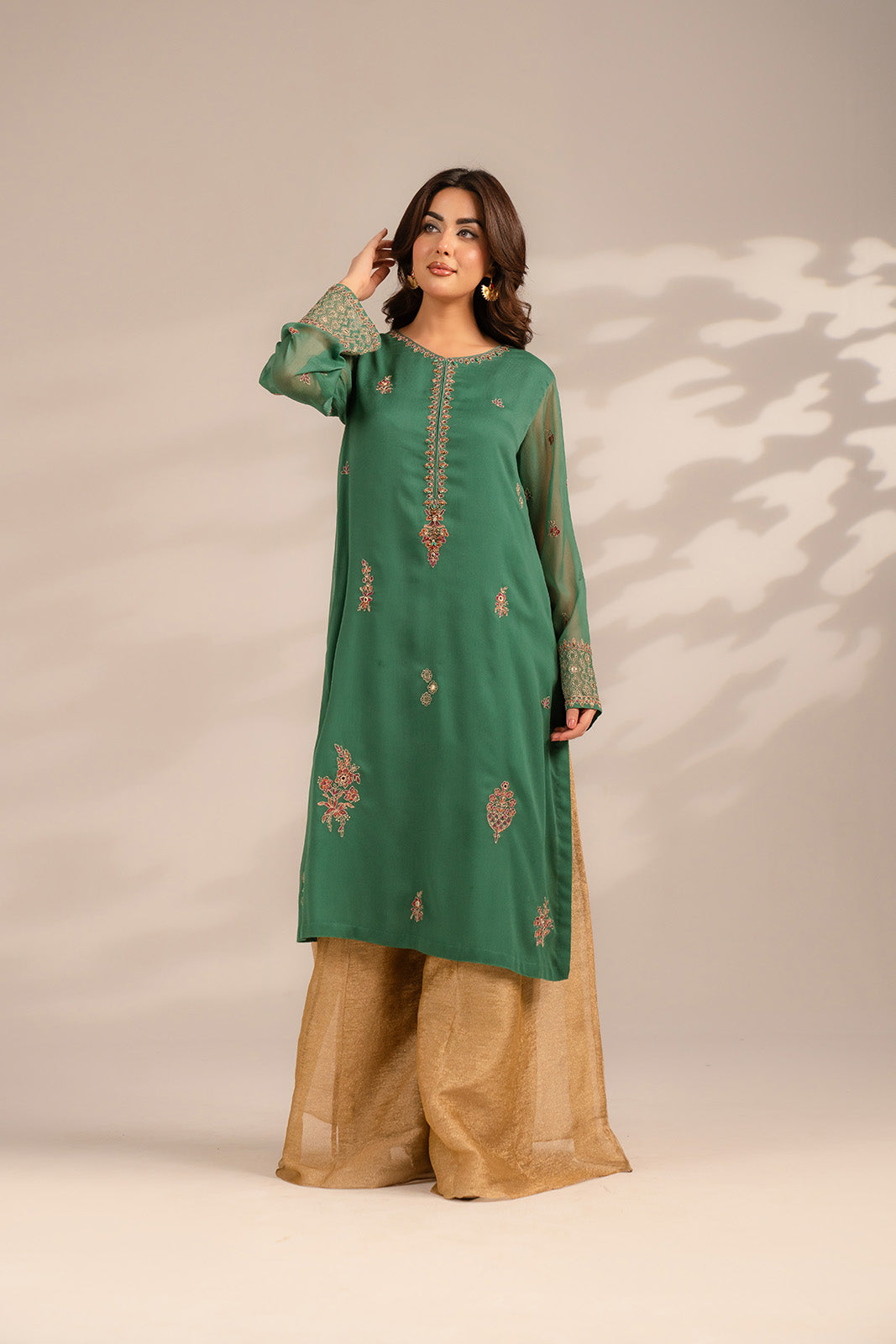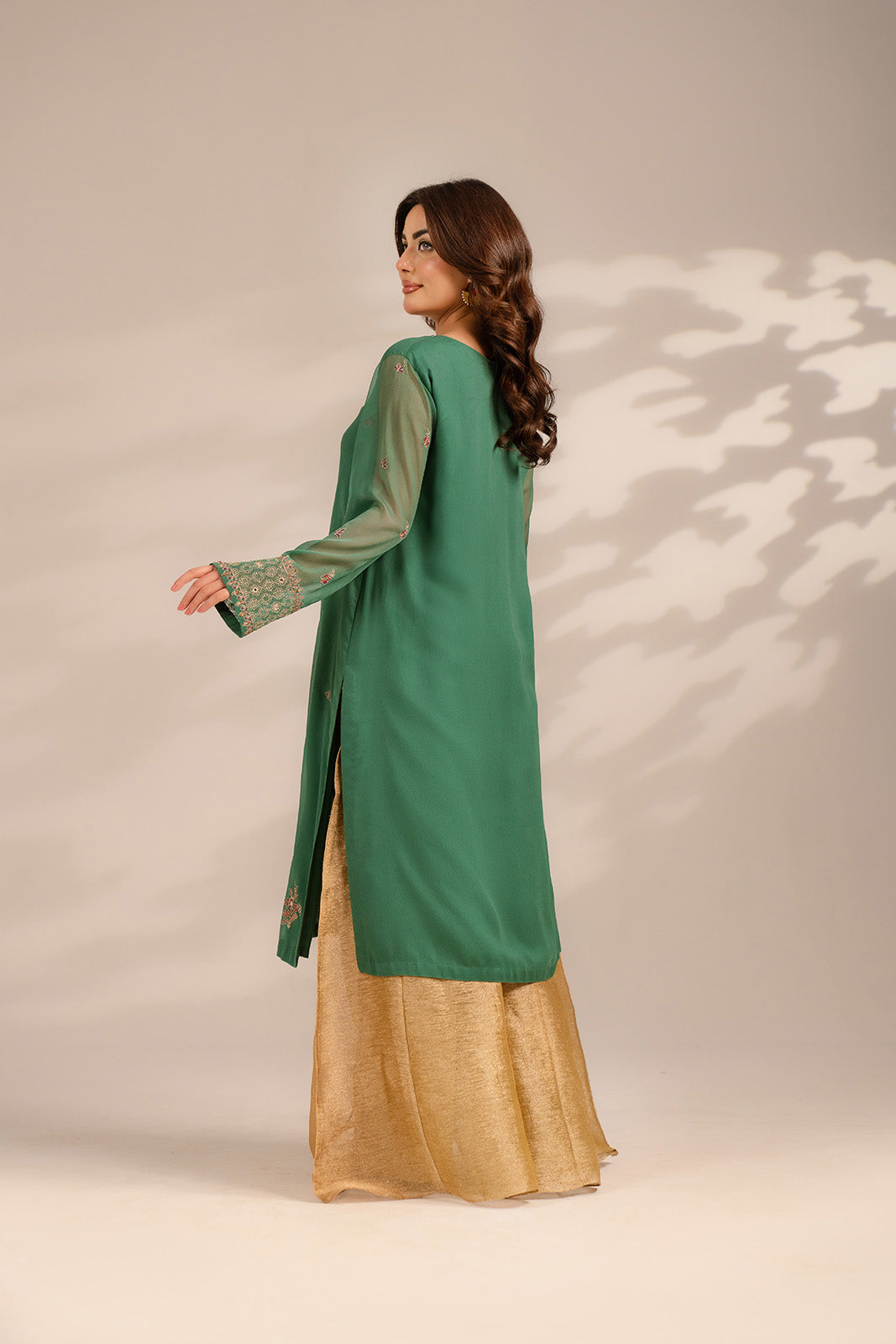 Jade green chiffon shirt paired with crush tissue sharara.