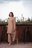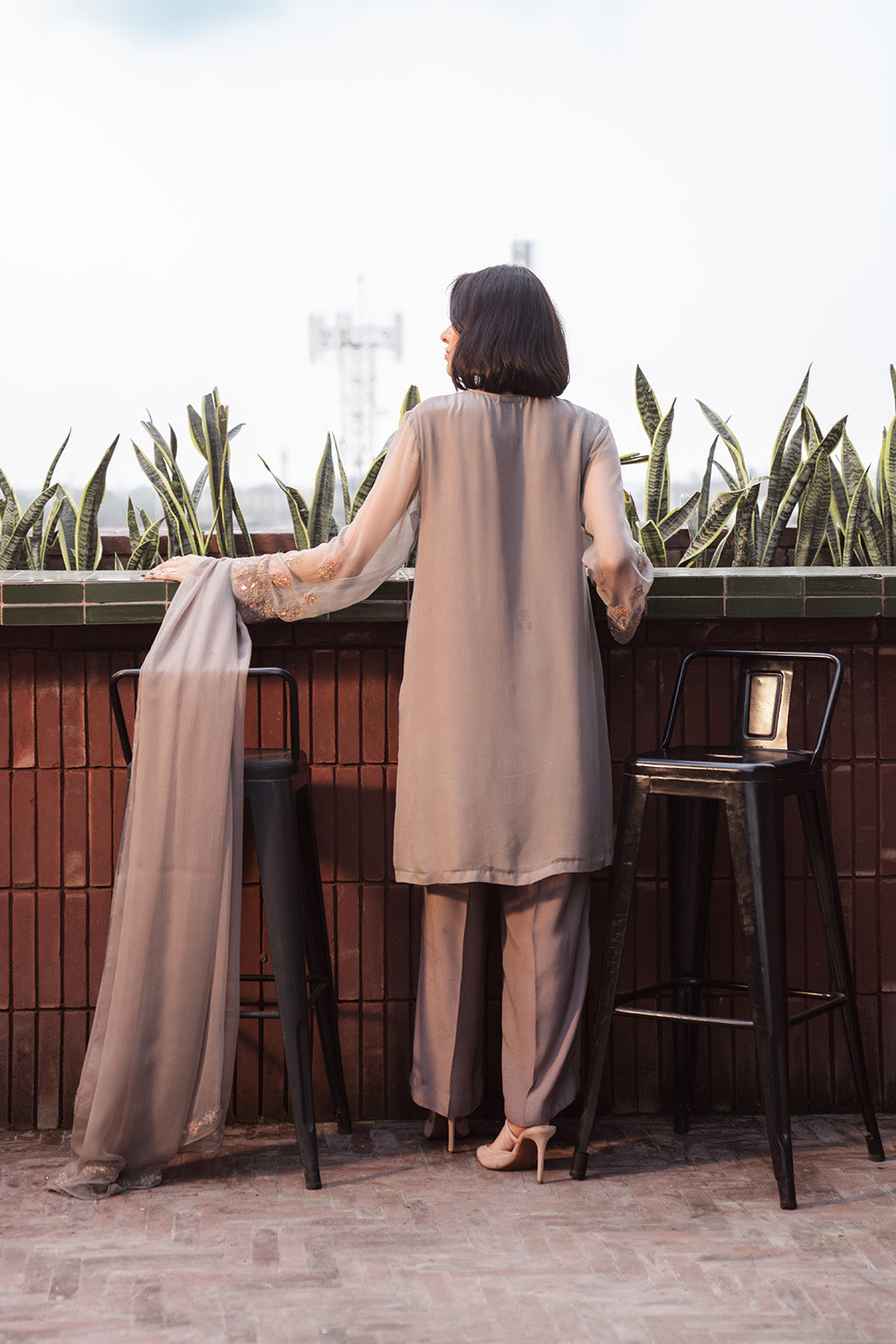Warm grey chiffon shirt and dupatta embellished with tilla, bobbin work, beads, crystals, sequins and mirror work, paired with grey silk culottes.