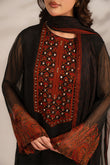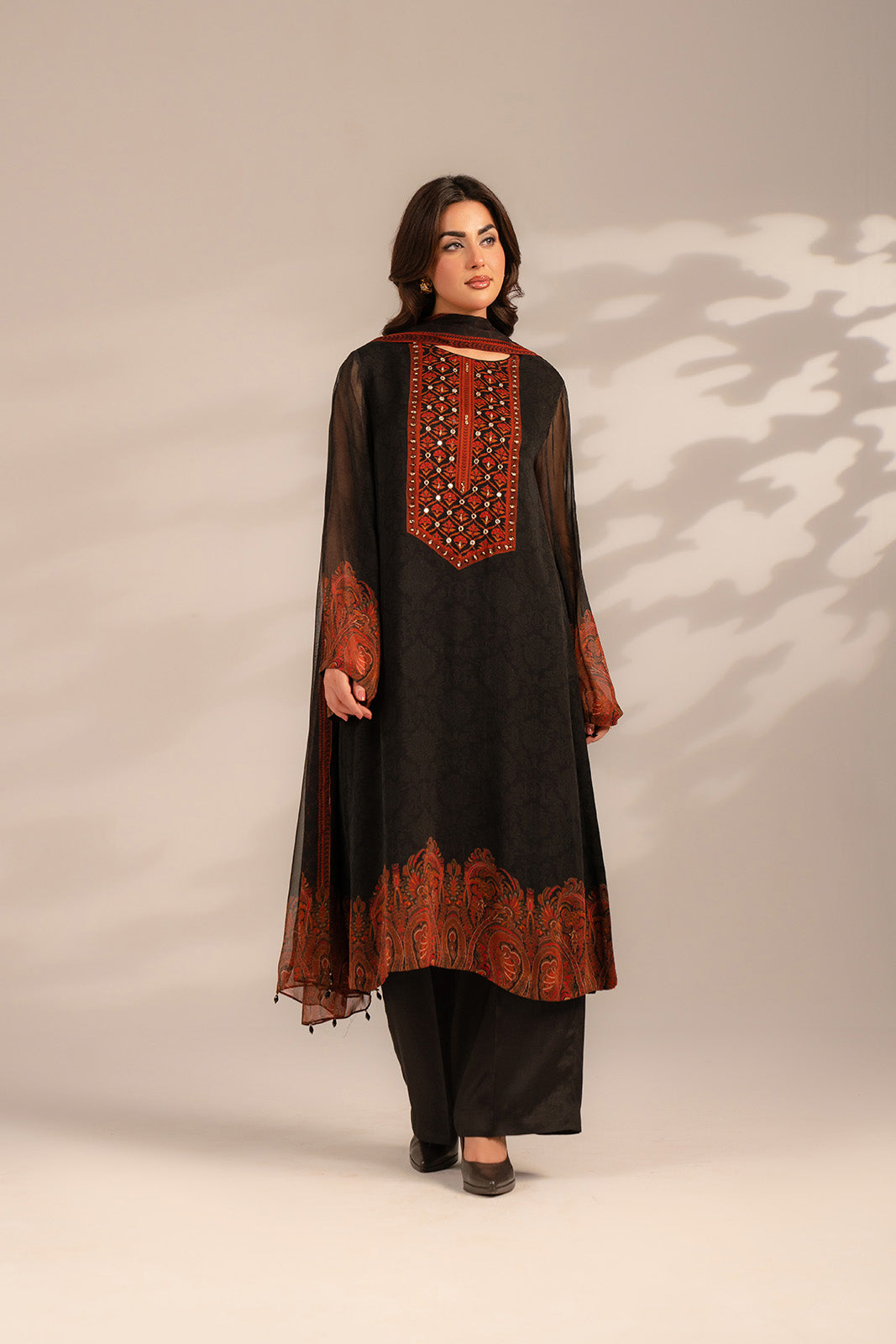 Chiffon Kashmiri paisley inspired print shirt and dupatta paired with silk culottes.