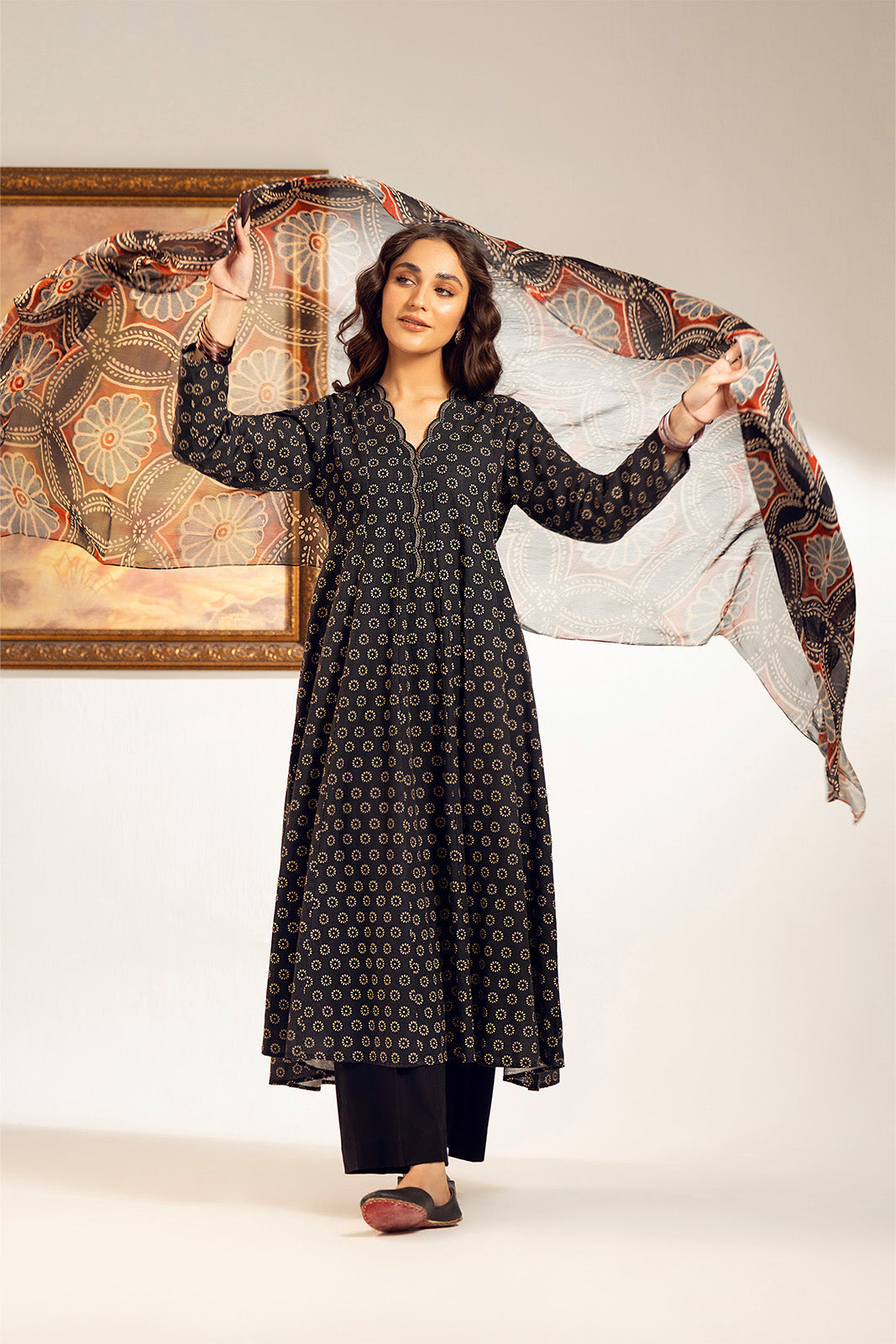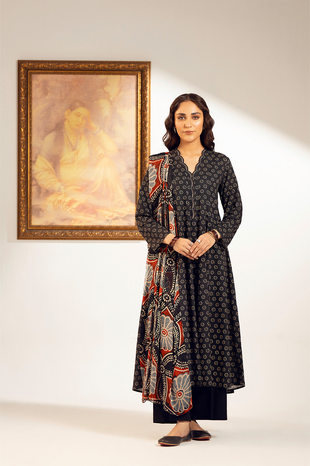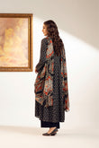 Black ajrak printed slub khaddar three piece suit detailed with printed shirt and dupatta with dyed trouser.