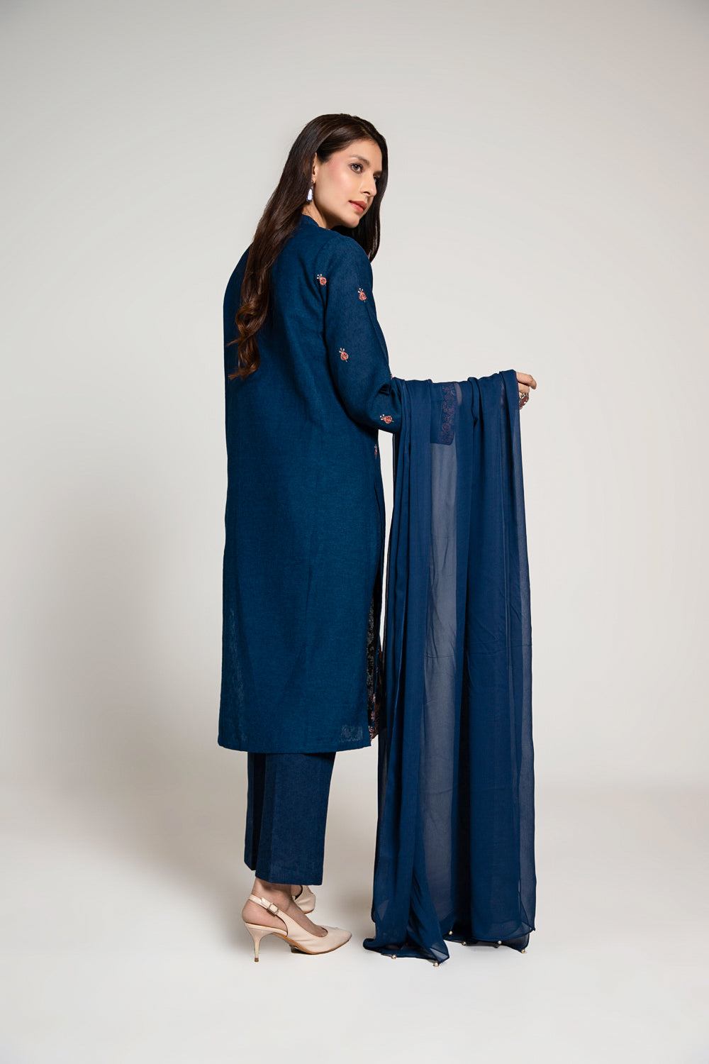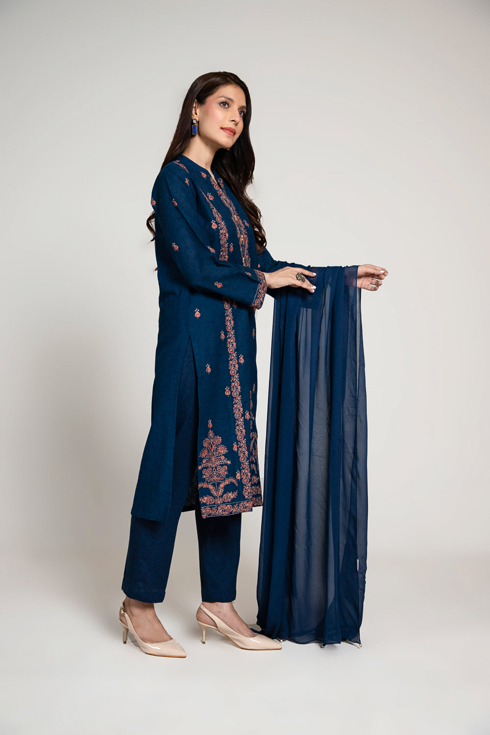 Blue 3-Pcfs Outfit With Full Heavy Embroidery On Front & Sleeves Paired With Chiffon Dupatta & Same Color Straight Trouser.