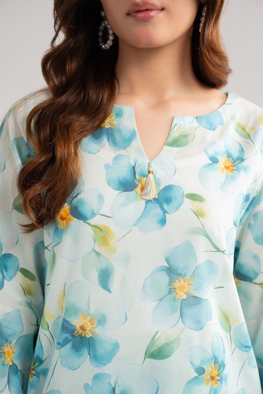 Floral Printed Two-Piece Suit Neckline Detailed with Tessel Shirt with Witte Trouser.
