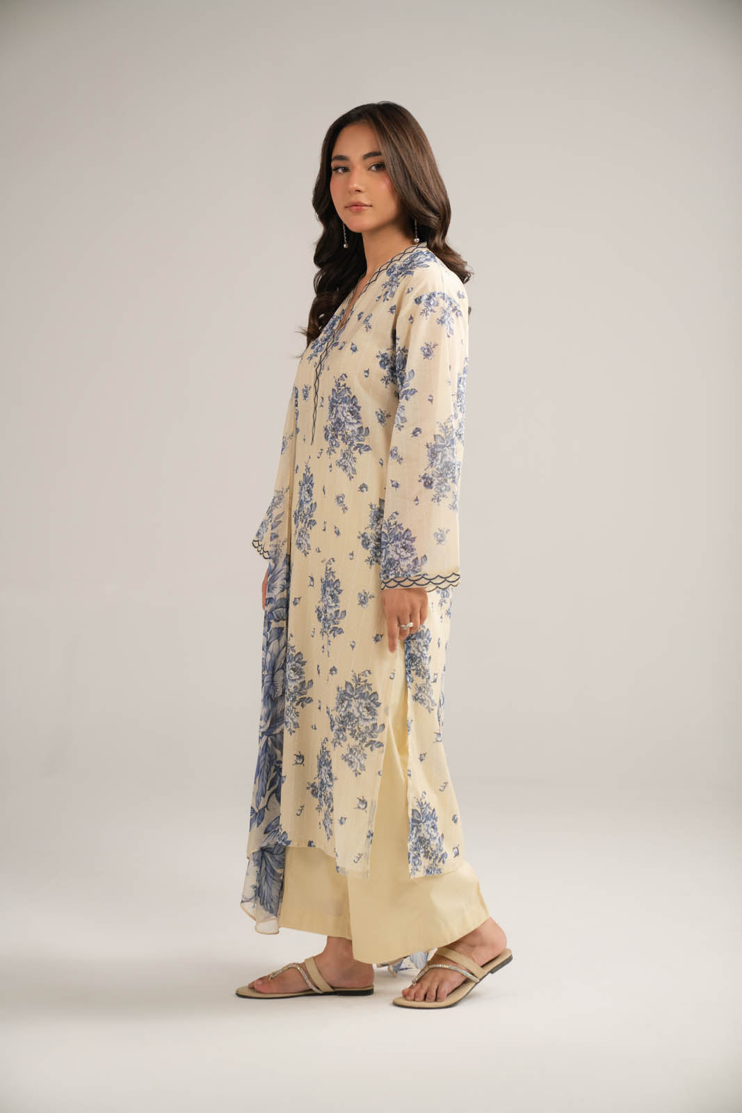 Off-white printed shirt with embroidery detail on sleeves and neckline paired with cambric culottes and printed chiffon dupatta.