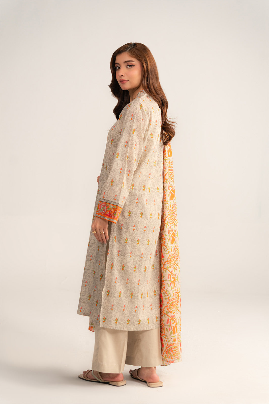 Printed 3-piece suit, printed shirt with button thread, printed dupatta along with plain trouser.