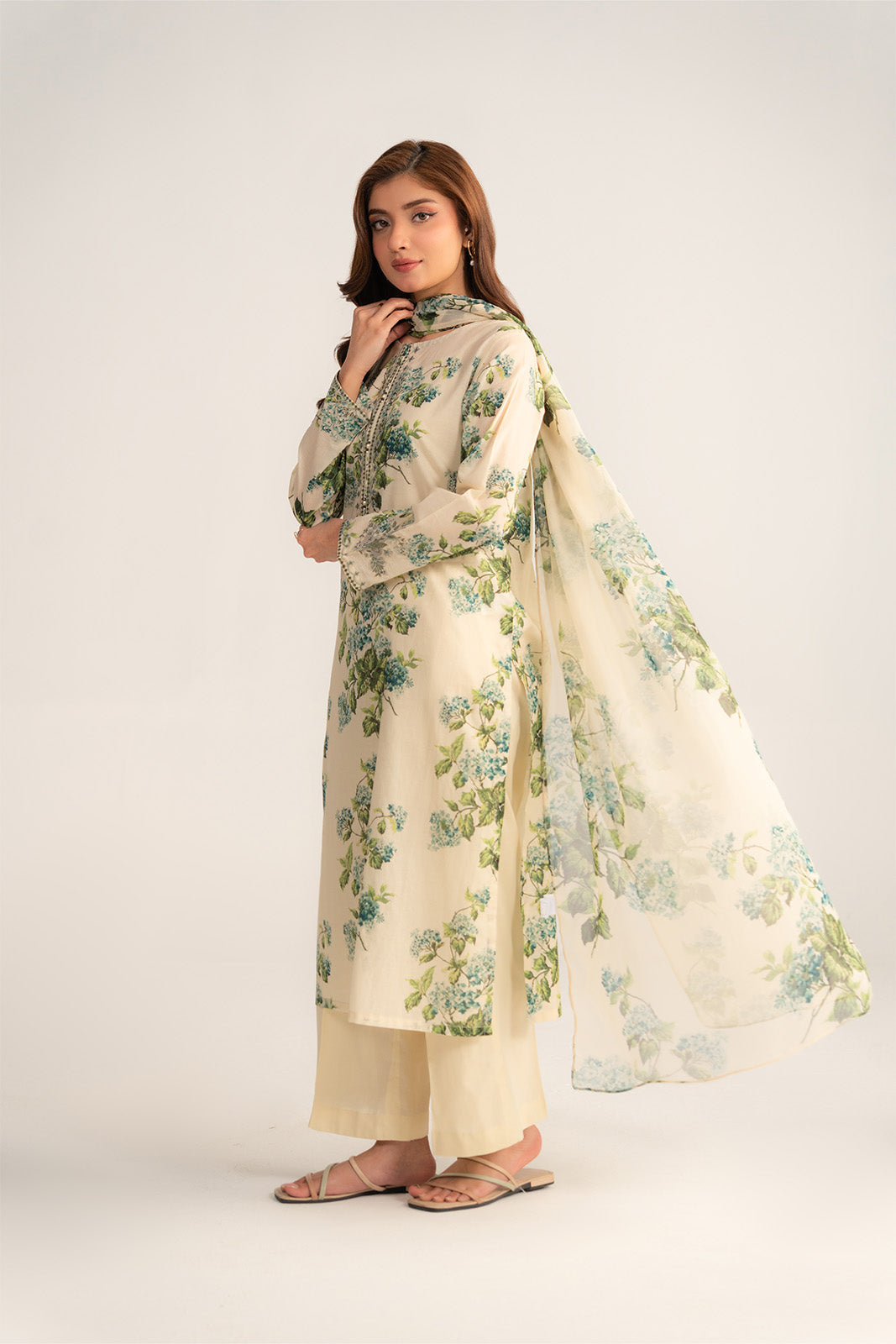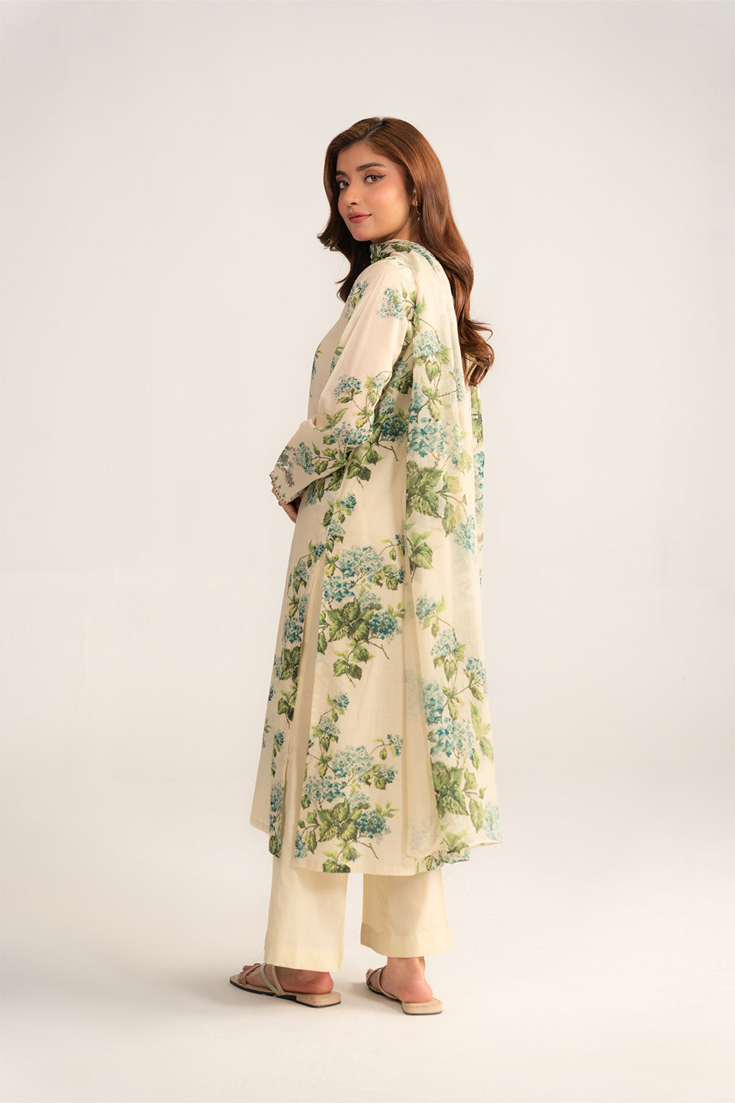 Off-white floral printed suit detailed with embroidery on shirt & paired with printed chiffon dupatta & culottes.