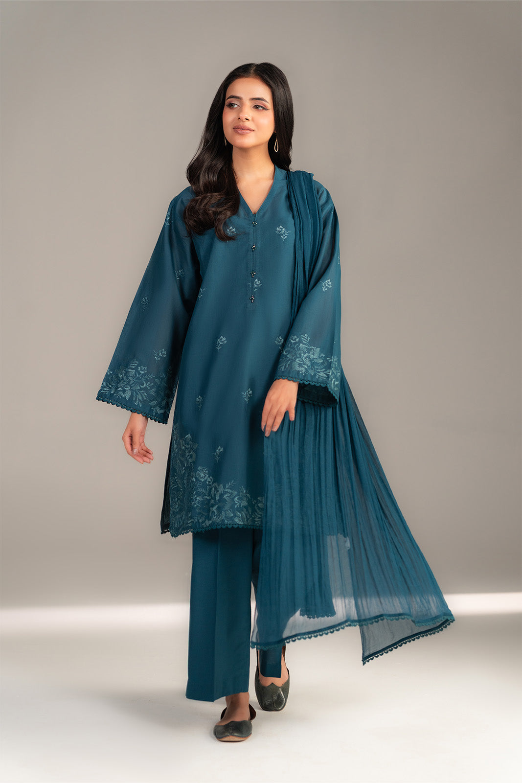 3 Piece lawn suit embroidered shirt paired with chiffon dupatta & cambric culottes.