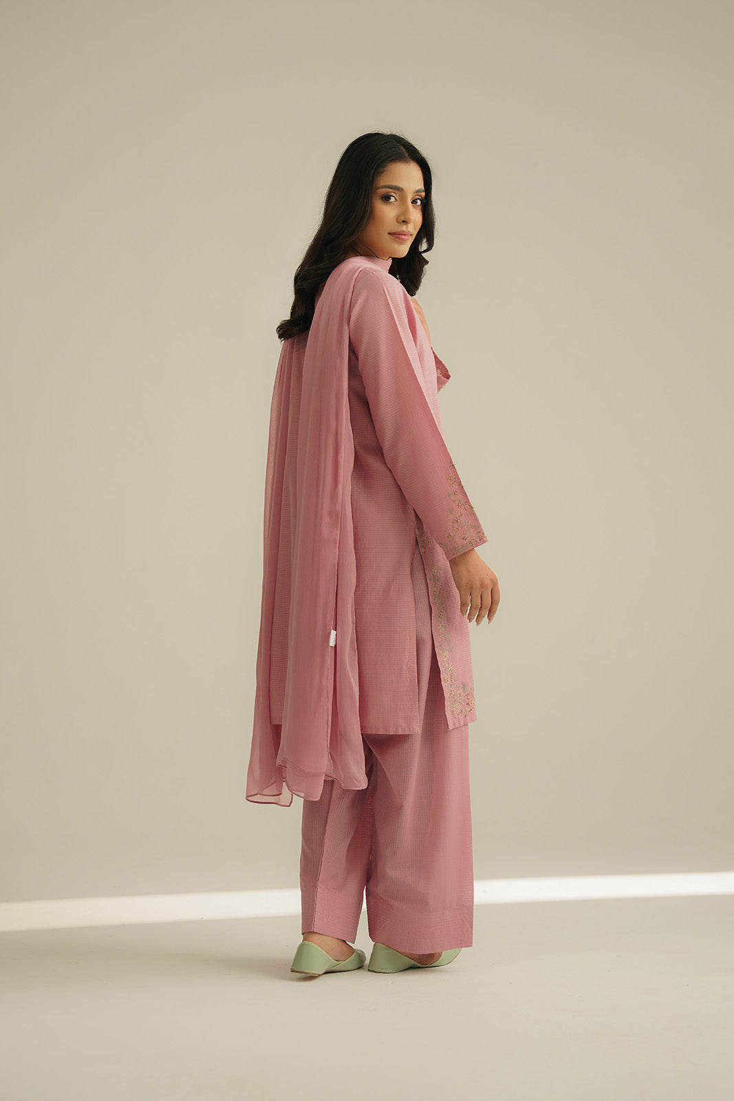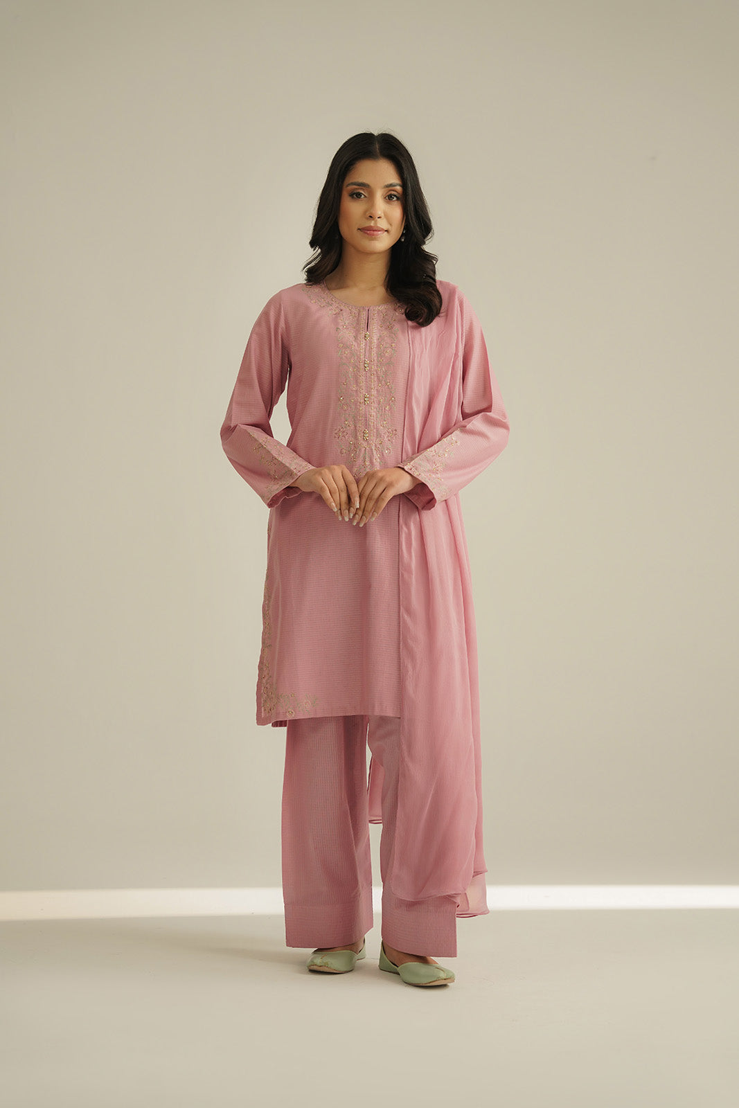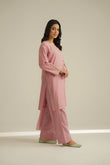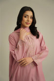 Tea pink embroidered shirt with embellishment, paired with a farshi shalwar and chiffon dupatta.
