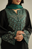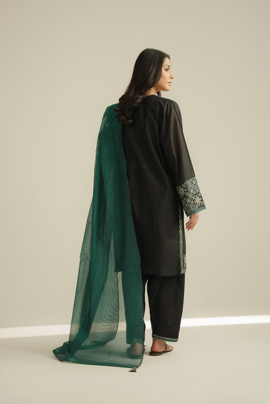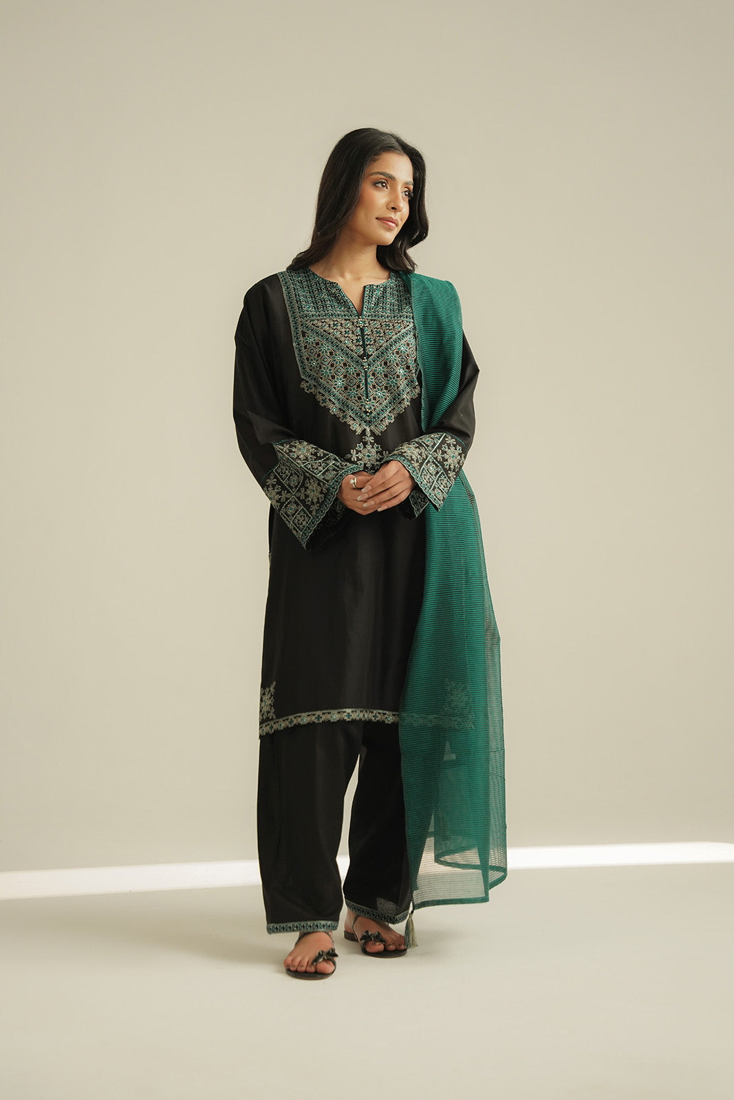 3 Piece stitched embroidered, embroidered neckline adda work and hem corner motif embroidered plain trouser& dupatta.