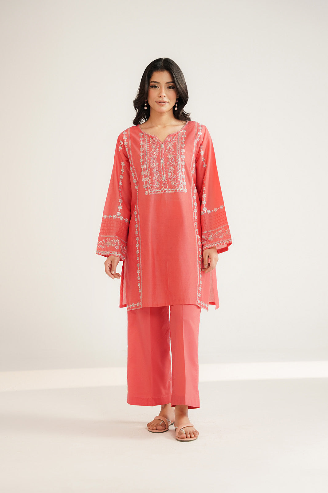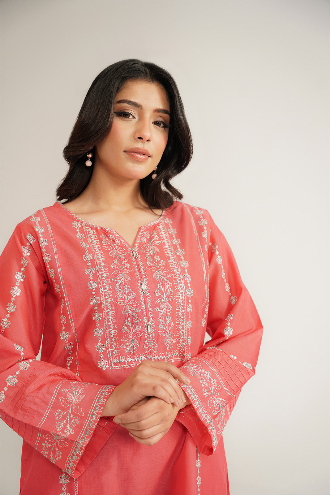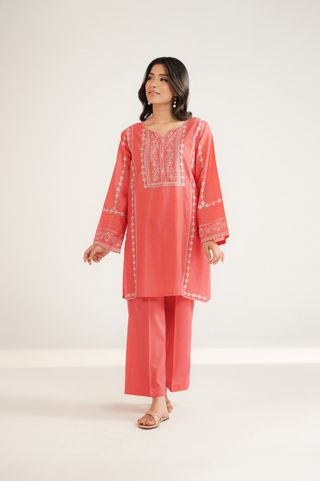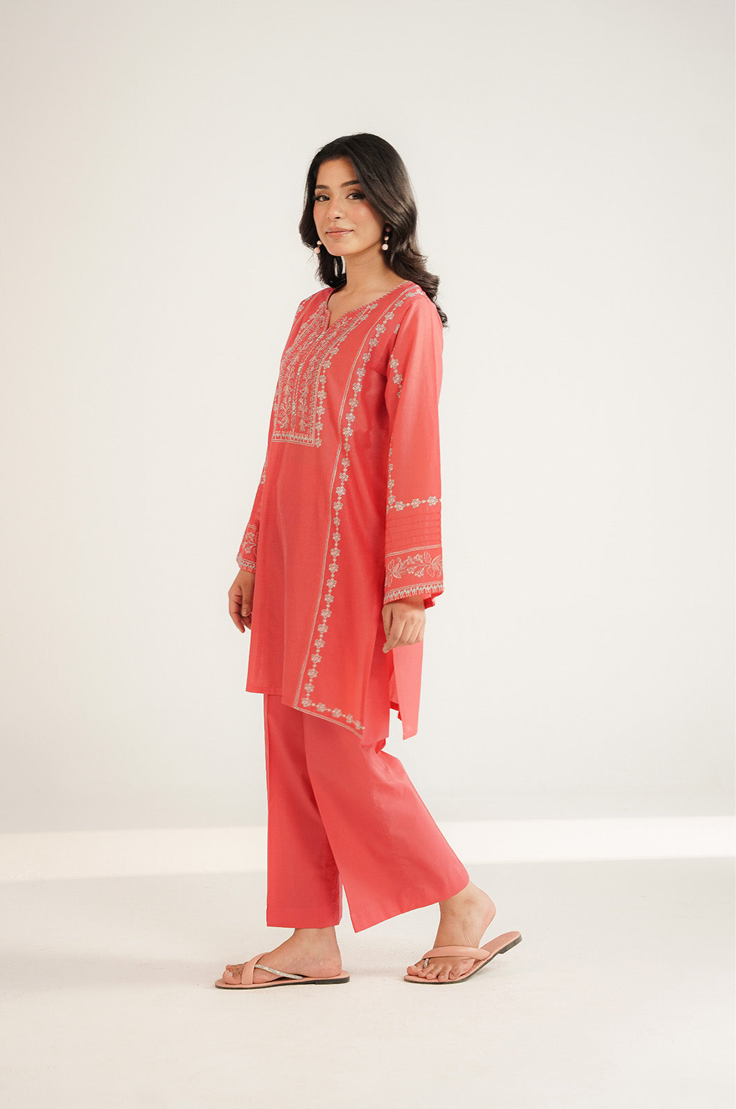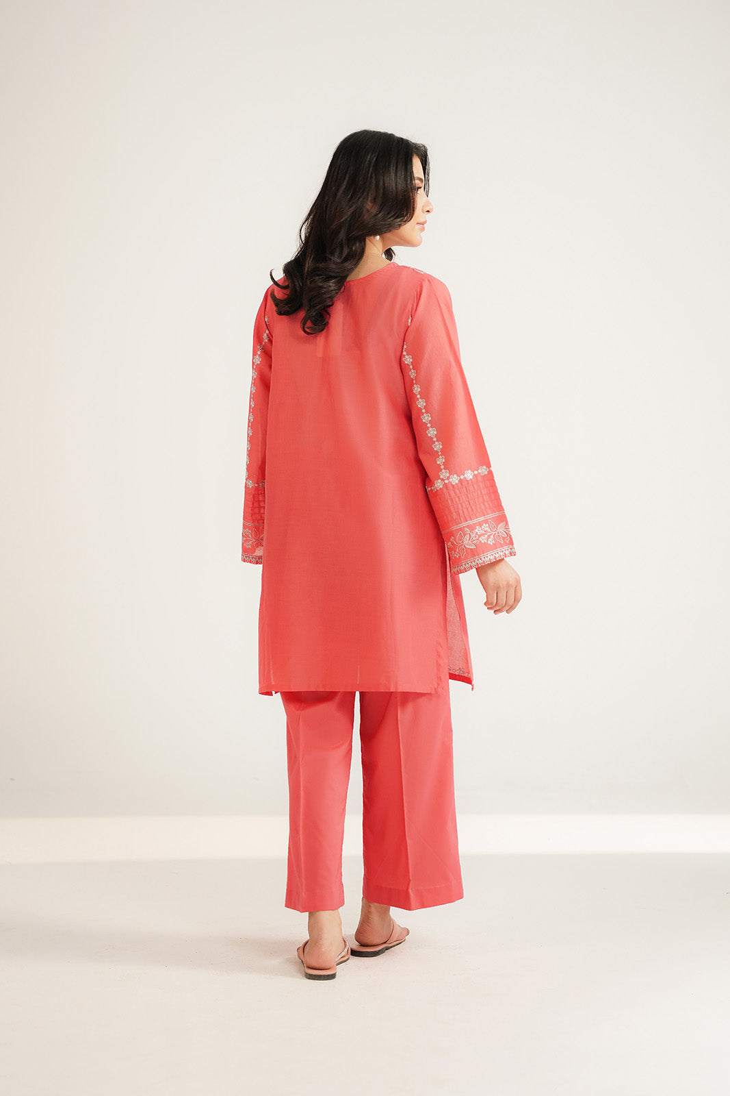 Coral lawn embroidered shirt paired with cambric culottes.