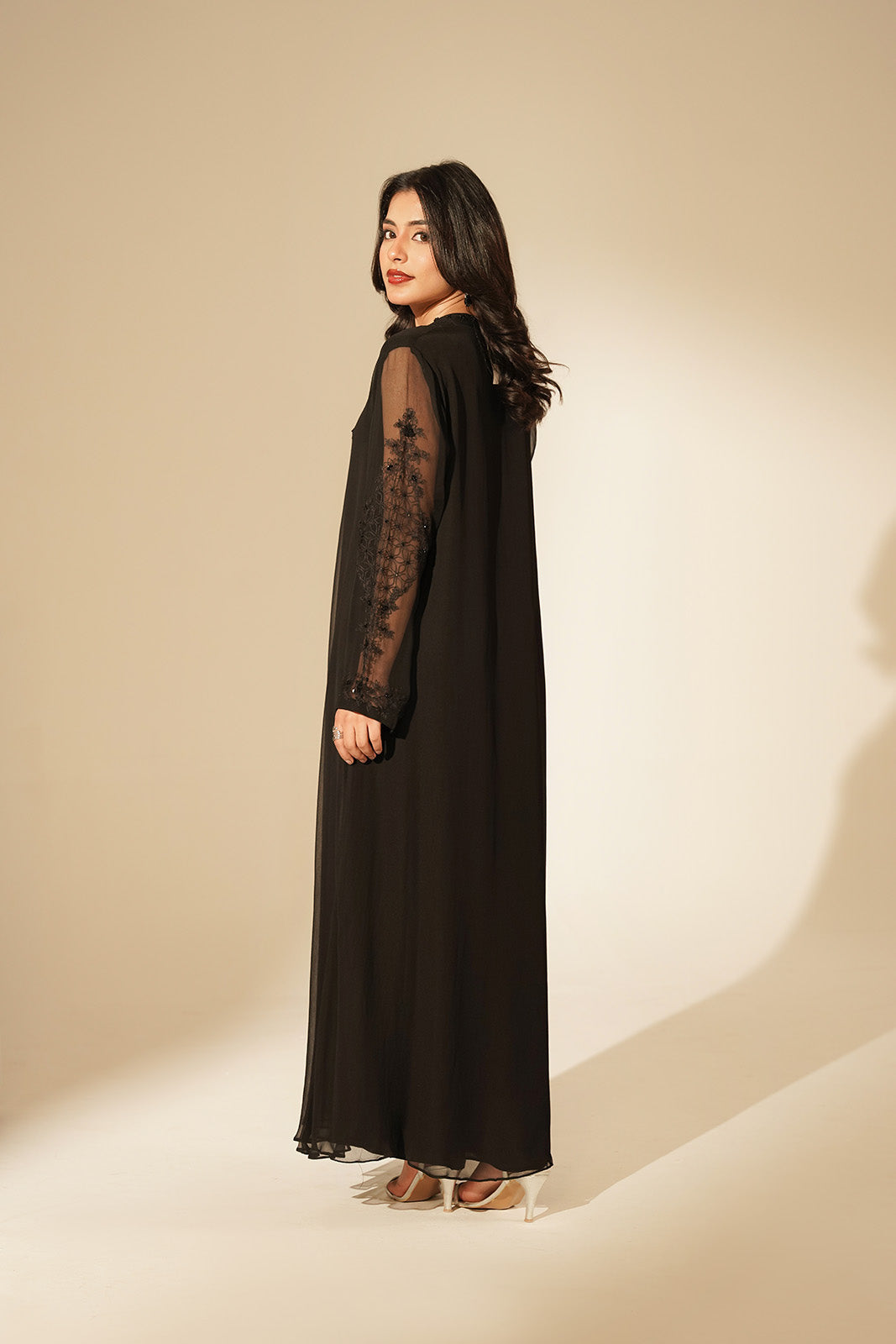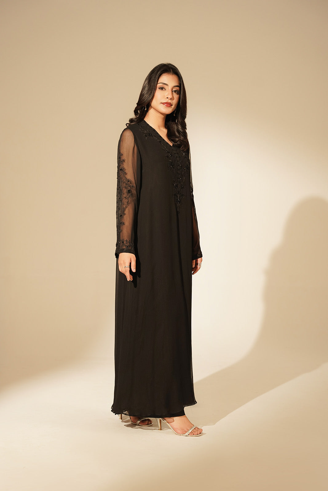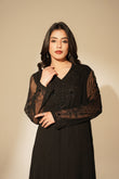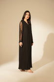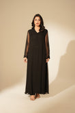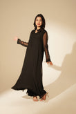 Black chiffon floor length dress embellished with cut dana ribbon, thread work.