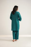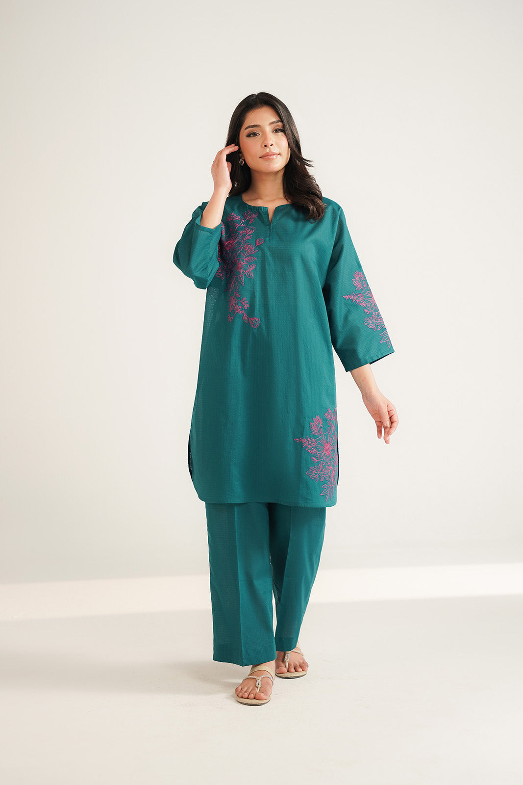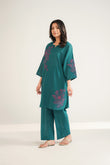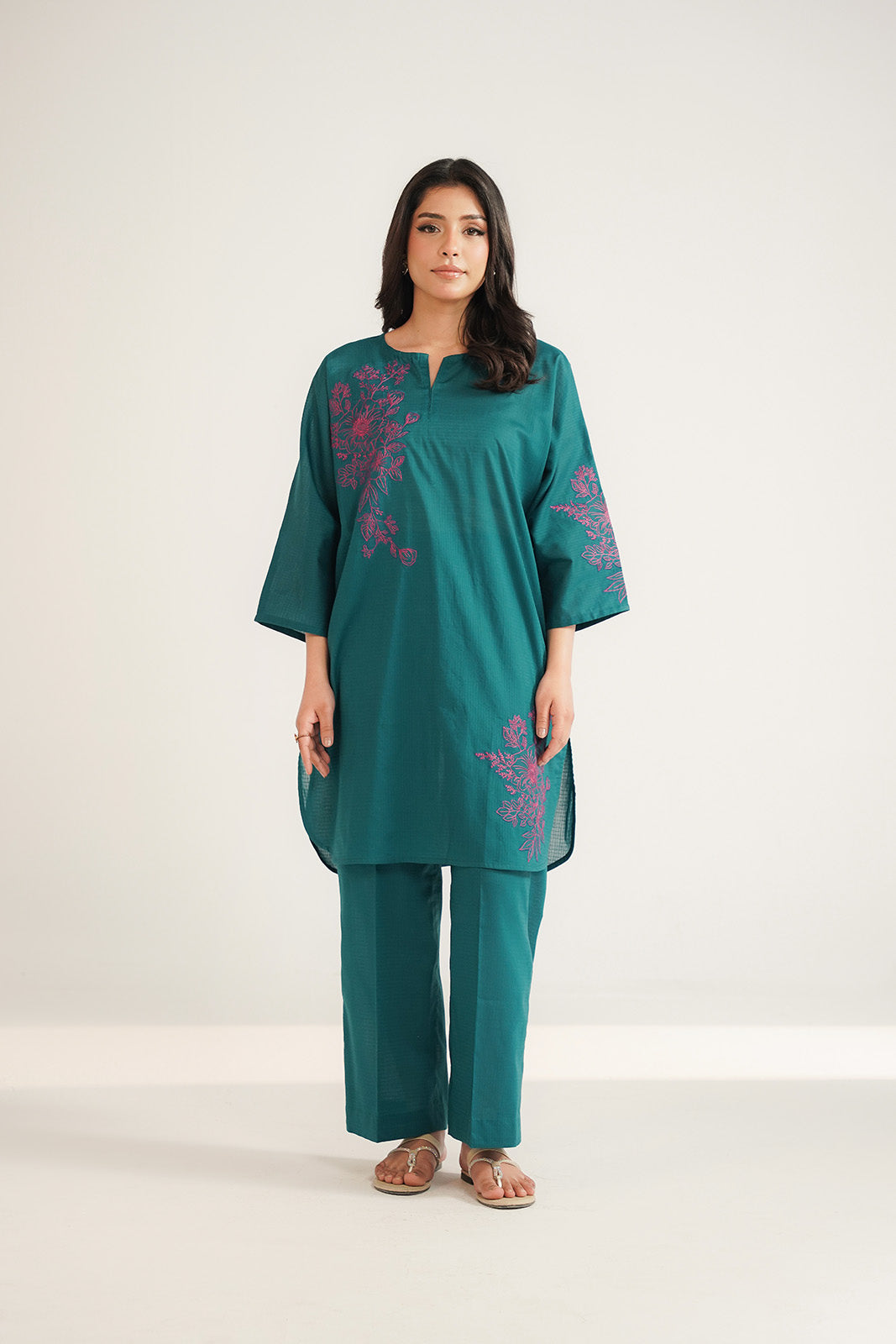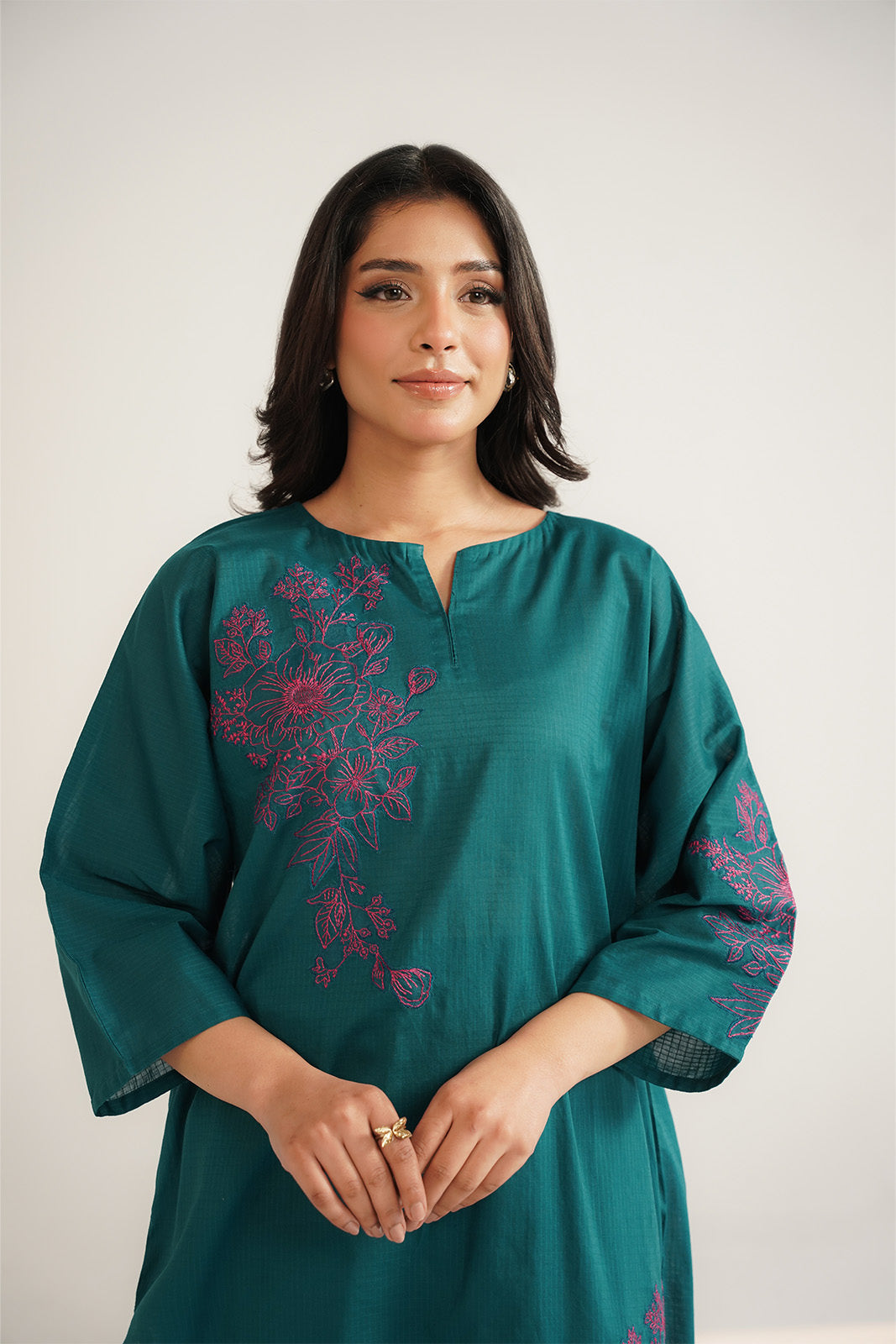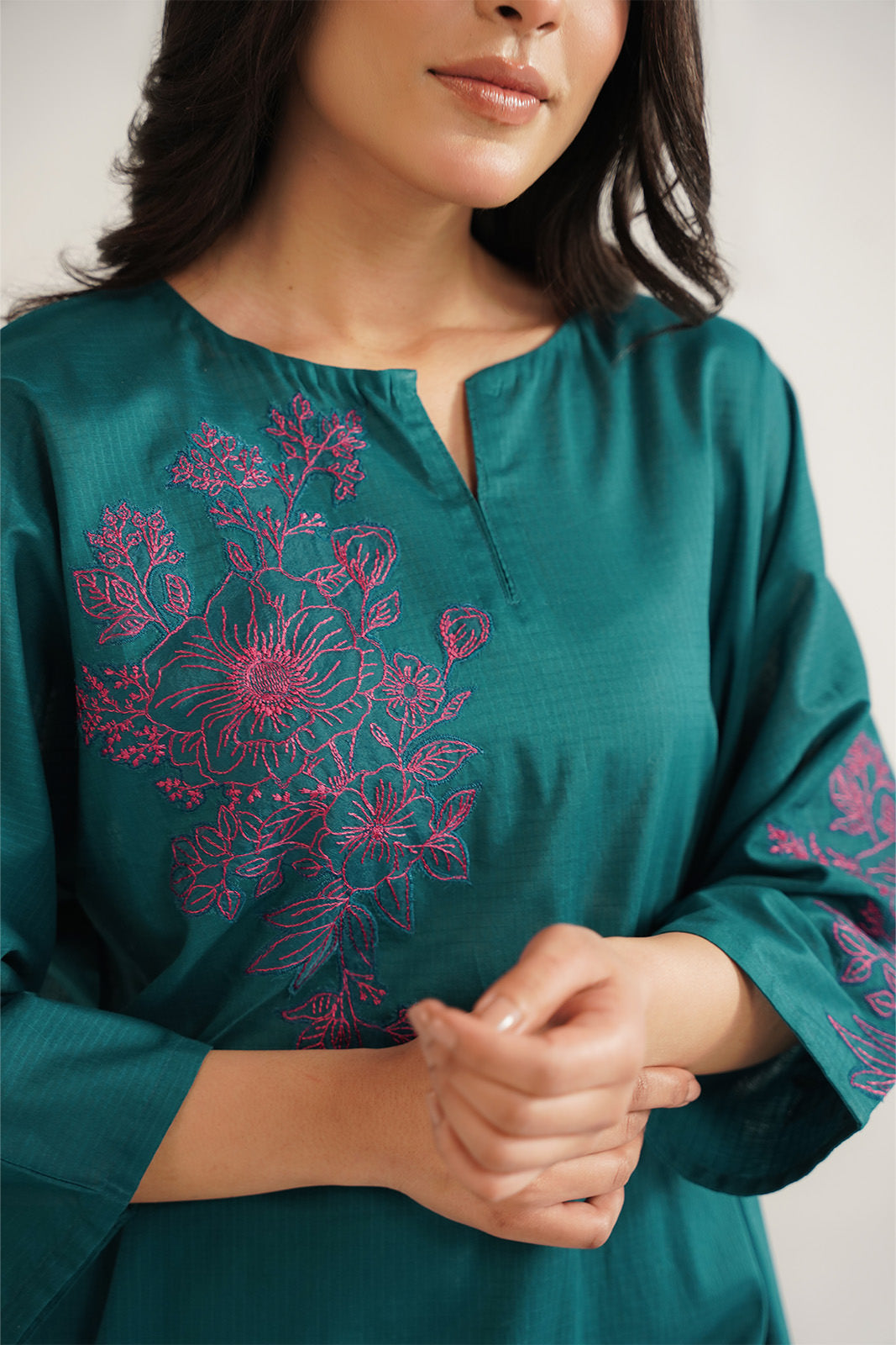 Blue cotton ripstop embroidered 2-piece suit detailed with floral embroidery on shirt & paired with culottes.